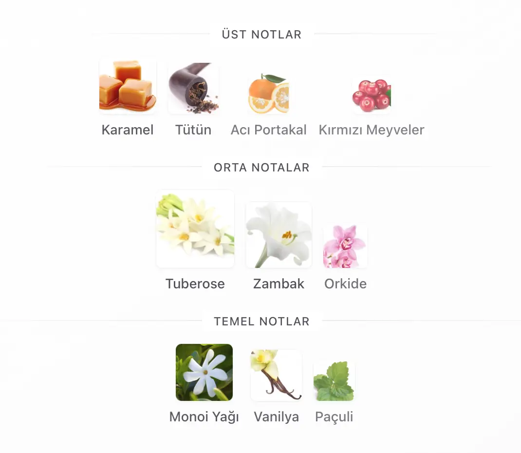 Orta notalarda tüberos, lilyum ve orkide gibi zarif çiçeksi notalarla zenginleştirilmiş bu parfüm, sofistike bir dokunuş katıyor.